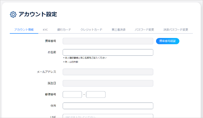 アカウント開設後、ログインをして残りの個人情報を設定します。