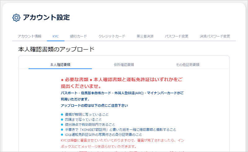 コニベットの本人確認は、本人確認書類や住所確認書類の提出、またその他証明書類の提出が必要です。本人確認などが必要な場合は以下になります。