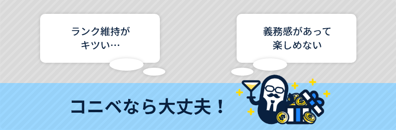 コニベットユーザー様限定のVIPプログラムは登録直後からスタート。維持するための条件がない、降格ナシのランク制度のため遊べば遊ぶほどステータスがアップします。