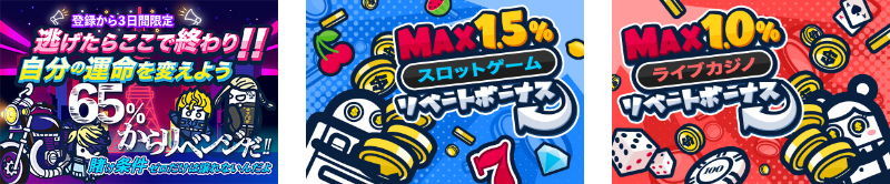 通常の返金割合は入金額の50%ですが、登録後3日以内(72時間以内)の新規プレイヤー様に限り65%に上乗せ中!